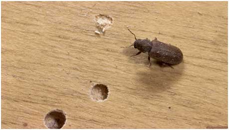 Wood borers (Powder Post Beetles) are tiny beetles whose larvae feed extensively on the wood. The wood worms while emerging make tiny pin size holes on the surface of wooden furniture or fixture. Those tiny holes which you see on wood surface are actually the exit -holes where the adult wood borer has left. The fine yellowish colored powder (Yellow Dust) starts appearing from these tiny holes. This indicates the destructive activity of borers deep inside the core of the wood as these are internal feeders. They feed on the cell contents of the sapwood. While feeding they make tunnels and pupate within the wood. Borers or Powder Post Beetles attack partially or fully seasoned wood with 10-15% moisture. (i.e almost dry condition).